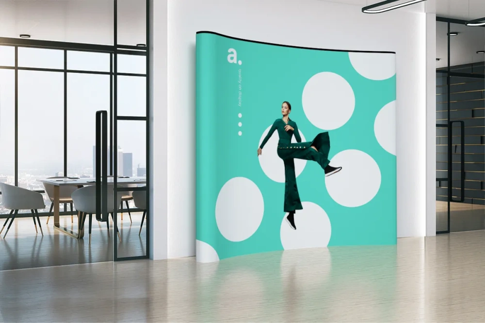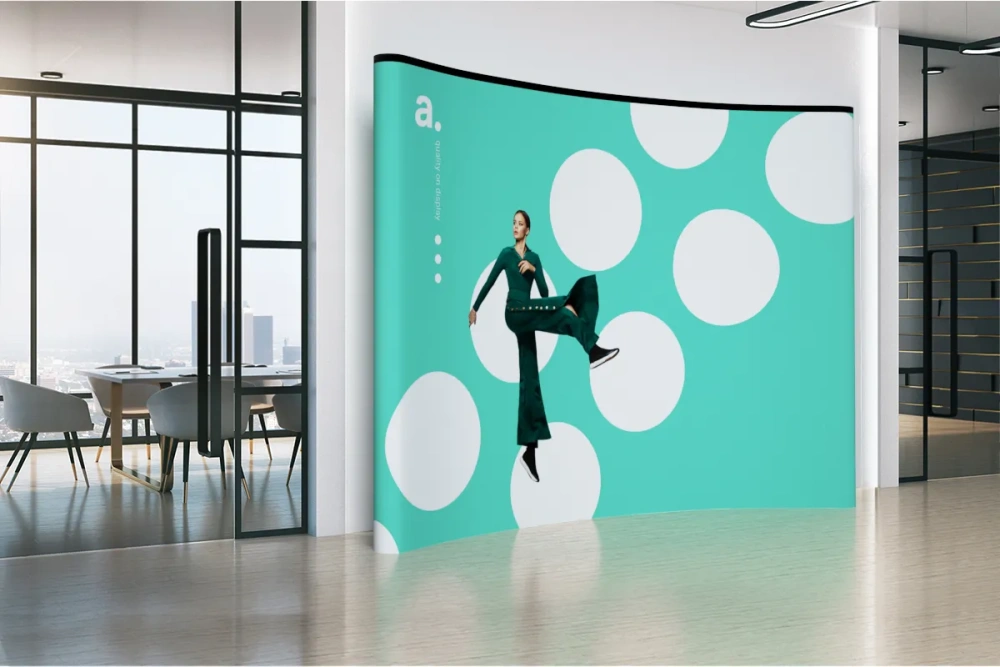 Biuro dekoravimas: iššokanti išlenkta siena taip pat gali būti naudojama jūsų įmonės būstinėje. Galite ją pastatyti registratūroje, kad pasitiktumėte svečius prie įėjimo, arba konferencijų salėje, kad sukurtumėte foną kalbantiems darbuotojams.