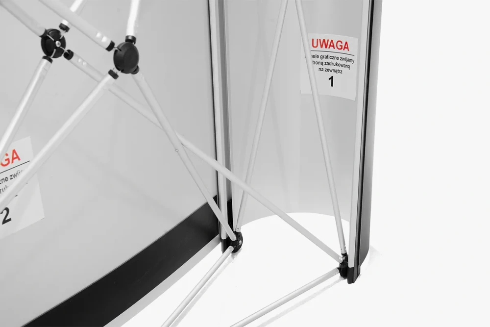 Iššokanti lenkta siena yra dviejų dydžių. Jos plotį galite reguliuoti pagal savo stendo poreikius. Be to, sieną galite aprūpinti LED apšvietimu. Pridedamas transportavimo dėklas gali būti lengvai naudojamas kaip prekystalis. Visa tai leidžia sukurti unikalų reklaminį stendą su vienu produktu.